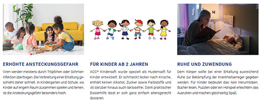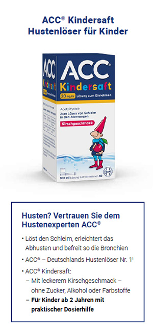 Kinder sind besonders häufig von einer Erkältung betroffen: Bis zu zehn Erkrankungen pro Jahr gelten als normal. Husten ist dabei ein häufiges und störendes Symptom: Im Verlauf der Erkältung bildet sich zäher Schleim in den Atemwegen, der nur schwer abgehustet werden kann. Gut, dass es ACC® Kindersaft gibt! Neben liebevoller Pflege und Zuwendung erleichtert ACC® Kindersaft das Abhusten von zähflüssigem Schleim. Ohne Al kohol, Zucker oder Farbstoffe ist er genau auf die Bedürfnisse von kleinen Hustenpatienten ab 2 Jahren zugeschnitten. Dank der praktischen Dosierhilfe nimmt Ihr Kind immer die richtige Menge Hustensaft ein. Und der leckere Kirschgeschmack kommt gerade bei Kindern gut an. Denn ACC® Kindersaft löst den Schleim, erleichtert das Abhusten und befreit so die Bronchien.
