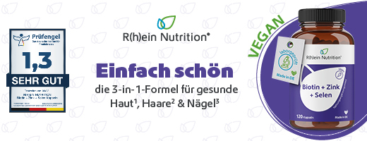 Haut, Haare und Nägel benötigen Zeit, um durch die Ernährung positiv beeinflusst zu werden. Deshalb ist eine Einnahme von „Biotin + Zink + Selen für Haut, Haare & Nägel“ von R(h)ein Nutrition über mehrere Monate zu empfehlen. In einigen Fällen kann ggf. auch eine dauerhafte Einnahme sinnvoll sein.