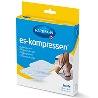 HARTMANN ES-Kompressen sind der Klassiker unter den Mullkompressen. Die eingeschlagenen Schnittkanten verhindern das Risiko, dass störende Randfäden sich ablösen und in die Wunde gelangen. Die Kompresse ist mehrfach aufklappbar. So besteht die Möglichkeit verschieden große Körperstellen vollständig abzudecken. Die Sterilität der ES-Kompresse ermöglicht die Erstversorgung verschmutzter und nässender Wunden. Zudem kann die ES-Kompresse neben der allgemeinen Funktion der Wundabdeckung auch als Trägermaterial für Salbe dienen, oder eine polsternde Funktion im Rahmen der Wundversorgung einnehmen.