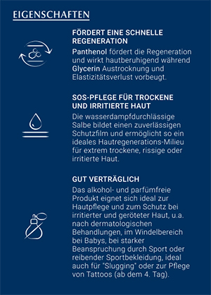 - Hautschutz für extrem trockene, rissige Hautstellen z. B. an Fersen, Nagelhaut, Ellenbogen