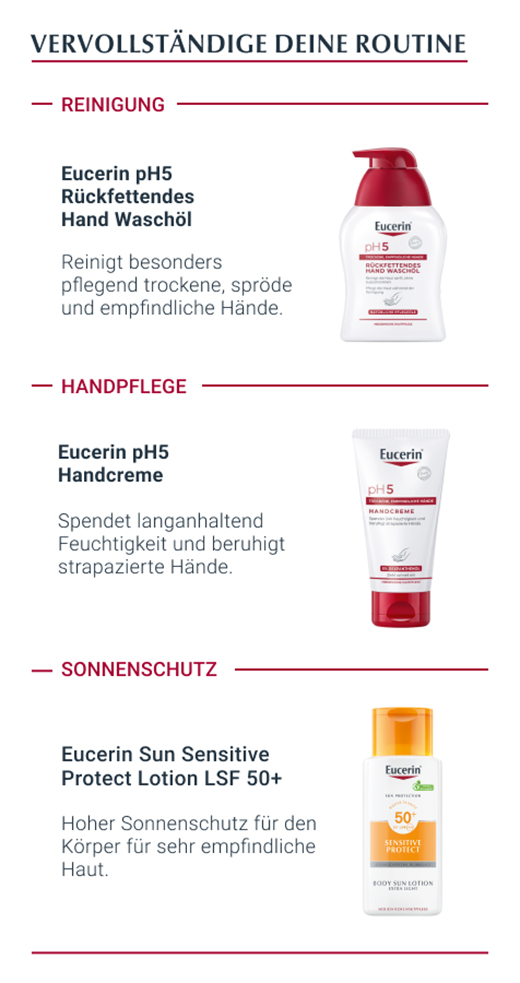 Eucerin pH5 Waschlotion eignet sich speziell für die milde Reinigung von empfindlicher, trockener Haut. Denn diese neigt dazu, besonders auf Umweltreize mit Spannungsgefühl, Hautrötungen und Irritationen zu reagieren. Daher braucht strapazierte Haut eine besonders milde Reinigung, die die physiologische Balance der Haut aufrechterhält.