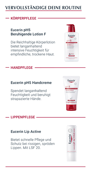 Eucerin pH5 Waschlotion eignet sich speziell für die milde Reinigung von empfindlicher, trockener Haut. Denn diese neigt dazu, besonders auf Umweltreize mit Spannungsgefühl, Hautrötungen und Irritationen zu reagieren. Daher braucht strapazierte Haut eine besonders milde Reinigung, die die physiologische Balance der Haut aufrechterhält.