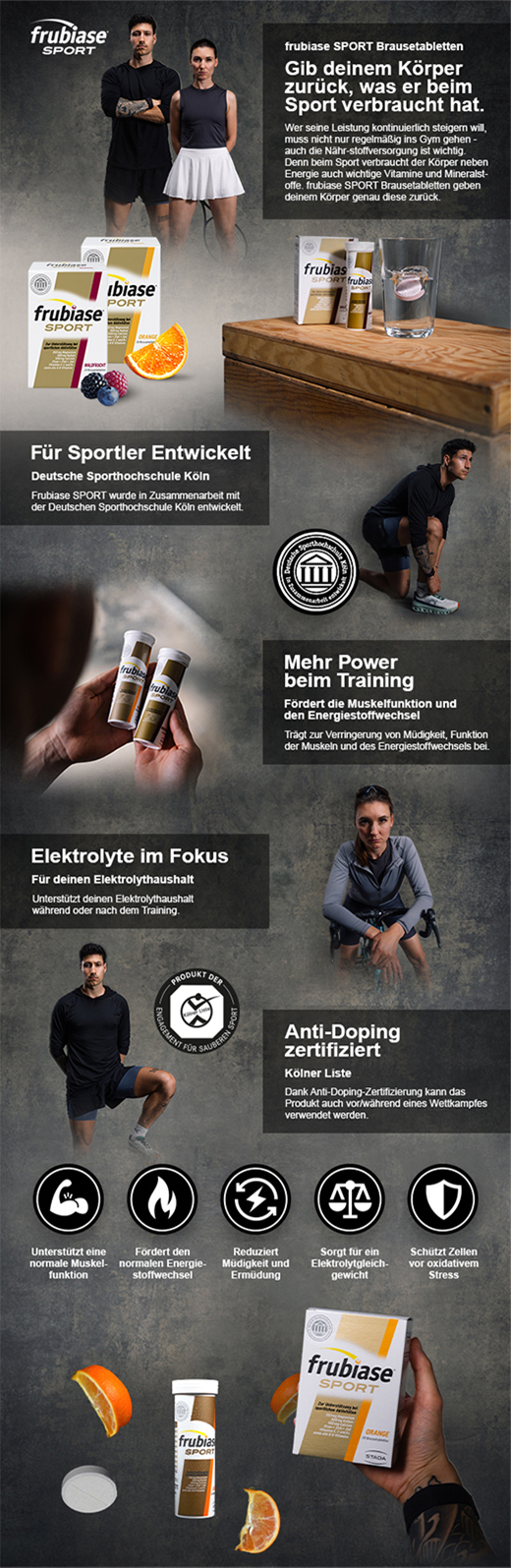 frubiase® SPORT Brausetabletten sind hochdosiert. Die angegebene tägliche Verzehrmenge von einer Brausetablette pro Tag darf nicht überschritten werden. frubiase® SPORT Brausetabletten können bei übermäßigem Verzehr abführend wirken. Nahrungsergänzungsmittel sollten nicht als Ersatz für eine ausgewogene und abwechslungsreiche Ernährung sowie eine gesunde Lebensweise verwendet werden.
