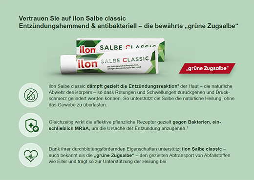 Als entzündungshemmende Salbe reduziert ilon® entzündungsfördernde Stoffe2 und fördert gleichzeitig den Abtransport von Abfallstoffen wie Eiter aufgrund ihrer durchblutungsfördernden Eigenschaften. So löst ilon® die Entzündung sanft aus der Haut und unterstützt die natürliche Abheilung. Aus diesem Grund wird die ilon® Salbe classic auch häufig als die „grüne Zugsalbe“ bezeichnet.