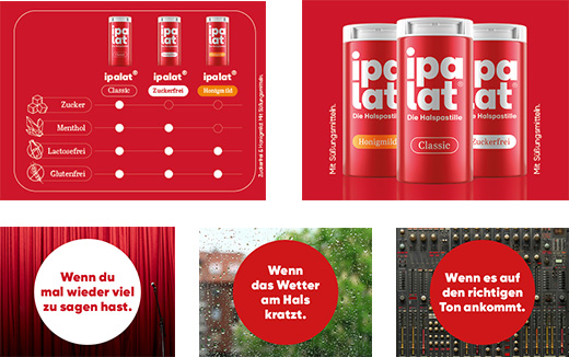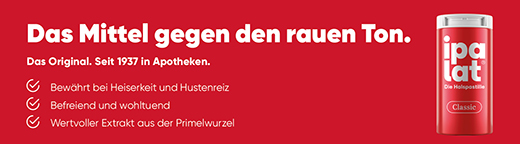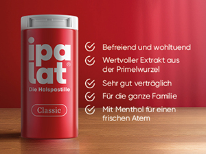 ipalat® Die Halspastille gibt es seit 1937 in Apotheken. Sie ist bewährt bei Heiserkeit und Hustenreiz, rauem Hals und Halskratzen sowie strapazierter Stimme. Das in ipalat® Classic enthaltene Menthol gibt zusätzlich ein Gefühl frischen und befreiten Atmens.