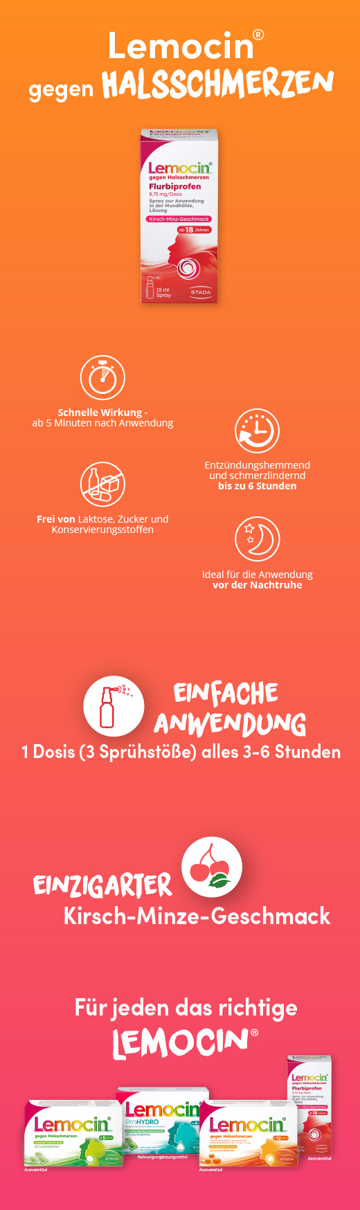 Lemocin® Flurbiprofen Spray eignet sich vor allem bei starken Halsschmerzen. Es wirkt ab 5 Minuten nach der Anwendung und ist bis zu 6 Stunden entzündungshemmend und schmerzlindernd.