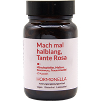 Unsere Zyklus-Kur ‚Mach mal halblang Tante Rosa‘ besteht aus hochdosiertem Mönchspfefferextrakt, Rosenwurz- Wurzelextrakt, Frauenmantelkraut und Melisse. Das Produkt wird in Deutschland entwickelt und hergestellt. Die Kapseln sind vegan, laktose-, gluten-, gelatine- sowie gentechnikfrei (GMO frei). Wir nutzen ausschließlich natü rliche Rohstoffe.