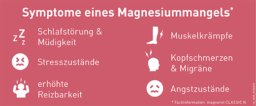 Muskelkrämpfe, Kopfschmerzen, Migräne, Übelkeit, Schlafstörungen, Appetitlosigkeit, Schwäche und mentale Symptome wie Reizbarkeit, Angst- und Stresszustände können zu den Symptomen gehören.1