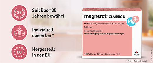 magnerot® CLASSIC N ist Ihre Lösung zur Behandlung von Muskelkrämpfen und Verspannungen, die durch Magnesiummangel verursacht werden. Dank der Formulierung wird der Wirkstoff bereits innerhalb von 10 Minuten freigesetzt3 und dem Körper zügig zur Verfügung stehen.