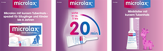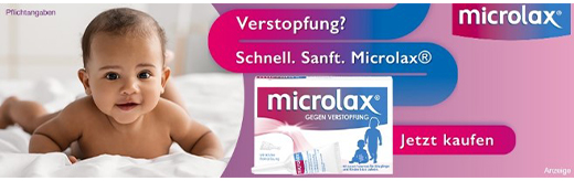 Microlax® mit kurzem Tubenhals hilft speziell Säuglingen und Kindern bis 6 Jahre- Microlax® mit kurzem Tubenhals sorgt für eine schnelle, sanfte und planbare Erleichterung ohne lästige Bauchkrämpfe oder Blähungen dank lokaler Anwendung. Das Miniklistier mit kurzem Tubenhals zeichnet sich durch eine hygienische und besonders sanfte rektale Anwendung aus. Die Wirkstoffkombination setzt das im Stuhl gebundene Wasser frei und weicht diesen auf. So kommt es meist bereits nach ca. 5 - 20 Minuten zu einer vollständigen Erleichterung.