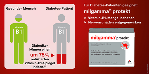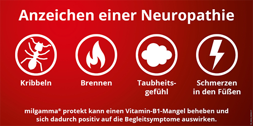 Da der erhöhte Bedarf an Vitamin B1 oft nicht allein durch die normale Ernährung gedeckt werden kann, ist es besonders wichtig, den Körper ausreichend mit Vitamin B1 zu versorgen. Der in milgamma® protekt enthaltene Wirkstoff Benfotiamin behebt den Vitamin-B1-Mangel als eine Ursache von Nervenschädigungen und kann so bei regelmäßiger Einnahme die Begleitsymptome einer auf einem Vitamin-B1-Mangel beruhenden Neuropathie wie Kribbeln, Brennen, Taubheitsgefühle und Schmerzen in den Füßen lindern.