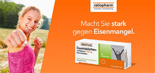 Eisentabletten-ratiopharm® N 50 mg Filmtabletten. Eisenmangel ausgleichen und sich wieder fit und aktiv fühlen, 50/100 Filmtabletten