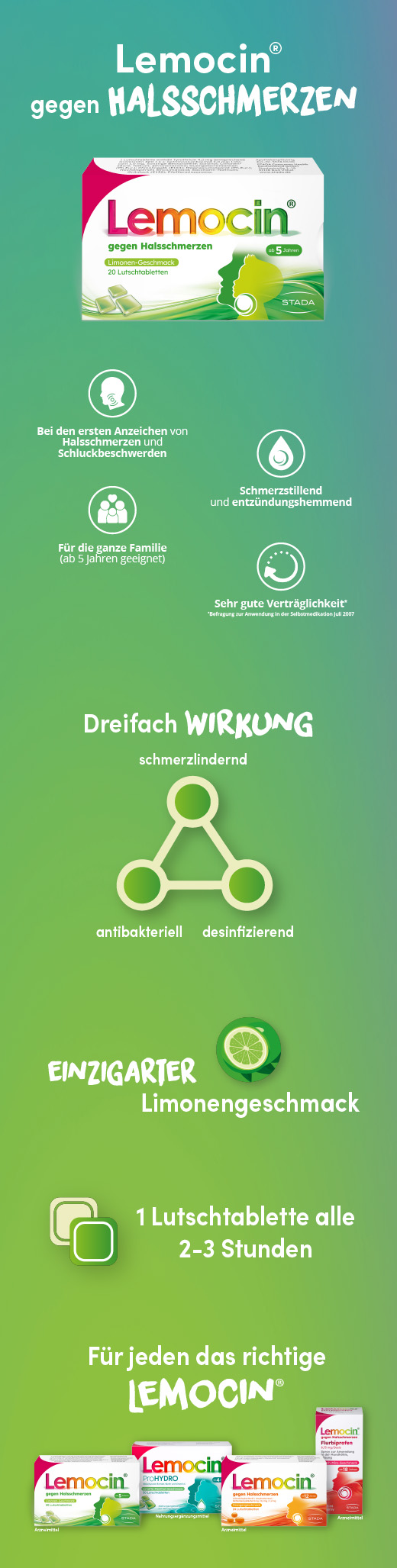Es muss nicht einmal eine richtige Halsentzündung oder Reizhusten sein: Schon bei den ersten Anzeichen von Halsschmerzen, wenn es im Hals kratzt, die Stimme belegt ist und Schluckbeschwerden auftreten, wird der Alltag beschwerlich. Besonders für Familien und berufstätige Eltern, die keine Zeit haben um krank zu sein. Lemocin® gegen Halsschmerzen hilft schon bei den ersten Anzei- chen von Schluckbeschwerden und verschafft effektiv Linderung. Denn Lemocin® Lutschtabletten wirken nicht nur schmerzlindernd, sondern auch antibakteriell und desinfizierend – und schmecken lecker nach Limone.