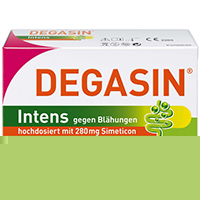 • DEGASIN® Intens ist mit 280 mg Simeticon ein hochdosiertes Simeticon-Präparat bei Blähungen und gasbedingte Beschwerden.