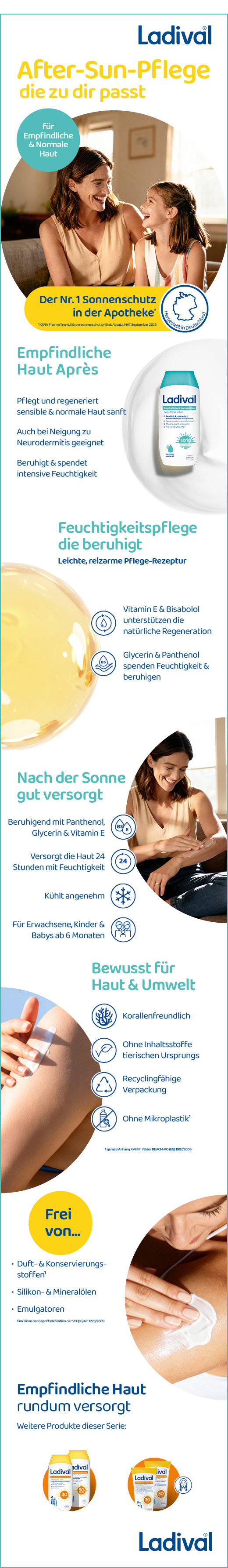 Ganzjähriger Sonnenschutz ist essenziell, da er nicht nur vor Sonnenbrand und sonnenbedingter Hautalterung schützt, sondern auch das Risiko an Hautkrebs zu erkranken reduziert. Um nach dem Sonnenbaden, die durch Sonneneinstrahlung beanspruchte Haut zu beruhigen, um zu hydratisieren, bietet Ladival zu Empfindliche & Normale Haut-Serie, die passende Ladival® Empfindliche & normale Haut Après Pflege-Lotion an. Nach dem Sonnenbaden ist es wichtig, die sonnengestresste Haut optimal zu pflegen und ihre Feuchtigkeitsspeicher aufzufüllen. Um Menschen mit empfindlicher Haut optimal zu versorgen, bietet Ladival® die Empfindliche & Normale Haut-Serie an. Diese wurde speziell für sensible und normale Haut entwickelt und spendet zusätzlich Feuchtigkeit. Sie beruhigt die durch Sonneneinstrahlung beanspruchte Haut und pflegt sie intensiv.