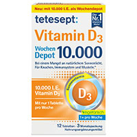 tetesept Vitamin D3 10.000 Wochendepot enthält 10.000 I. E. (=250μg/entspricht einer Tagesdosis von 35,7μg) hochdosiertes Vitamin D. Vitamin D ist wichtig für das Gleichgewicht der Körperfunktionen und trägt bei: *