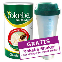 Als Ersatz für eine Mahlzeit werden 5 gestrichene Messlöffel (40 g) Yokebe Classic in 200 ml fettarme Milch (1,5 % Fett) eingerührt und ½ TL (1,5 g) Pflanzenöl mit hohem Gehalt an ungesättigten Fettsäuren (Sonnenblumen-, Distel- oder Traubenkernöl) hinzugegeben. Bitte geben Sie immer zuerst die Milch in den Shaker und erst dann das Pulver. Die Mischung gut umrühren oder schütteln. Das Befolgen des Zubereitungshinweises ist erforderlich.