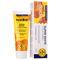 Nordics natürliche Repair und Whitening Zahnpasta Super White, vereint 97% natürliche Inhaltstoffe mit den Erkenntnissen der aktuellen Zahnforschung. Die doppelte Frische aus zwei Sorten Pfefferminze und Menthol, kombiniert mit Eukalyptus und Zitrone, erfrischen und sorgen für eine lang anhaltende Frische. Hydroxylapatit, auch flüssiger Zahnschmelz genannt, dieser kann mikroskopische Defekte der Zahnschmelzoberfläche reparieren, dadurch wirkt er der Abnutzung der Zähne entgegen. Das Reparieren und Erneuern des Zahnschmelzes wirkt sich zusätzlich positiv auf die Unempfindlichkeit der Zähne aus. Als positiver Nebeneffekt wird die Zahnoberfläche glatter, was dafür sorgt das sich die Neubildung von Zahnbelag und Zahnstein (Plaque) reduziert und Karies vorbeugt, zusätzlich wird die Zahnoberfläche dadurch heller und weißer. Polyvinylpyrrolidon (PVP) sorgt für eine verbesserte Reinigungseigenschaft der Zahnpasta wodurch Verunreinigungen effektiv entfernt werden können, zusätzlich hat PVP antibakterielle Eigenschaften die das Bakterienwachstum reduzieren. Zitronenöl sorgt nicht nur für ein außergewöhnliches Frischeerlebnis, es hilft auch sanft Zahnschmelzverfärbungen zu lösen, strafft sanft das Zahnfleisch, es besitzt antibakterielle und entzündungshemmende Eigenschaften und sorgt für frischen Atem. Pentanatriumtriphosphat sorgt dafür, das sich Verunreinigungen nicht sofort wieder am Zahnschmelz festsetzen können und trägt dazu bei, dass der Zahnschmelzabbau reduziert und Karies verhindert wird. Pfefferminzöl und das enthaltene Anis, helfen bei der Reduktion von Bakterien und Mundgeruch, wirken beruhigend und entzündungshemmend. Sorbitol, reduziert die Säureproduktion der Mundbakterien. Eukalyptusöl und Caravone aus natürlichen Dill, reduzieren die Bildung von Zahnstein und wirken Zahnfleischproblemen / Zahnfleischbluten entgegen, zusätzlich wirken sie desinfizierend, wodurch die Neubildung von Bakterien und Mundgeruch effektiv reduziert wird.