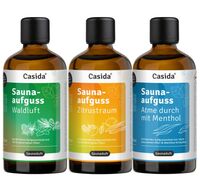 Das Casida® Saunaaufguss Bestseller Set vereint drei beliebte Duftkompositionen für die Sauna. Die Mischungen Waldluft, Zitrustraum und Atme durch mit Menthol bringen natürliche Frische, belebende Klarheit und wohltuende Entspannung in jede Aufgussrunde – mit 100 % naturreinen ätherischen Ölen in geprüfter Casida® Qualität.