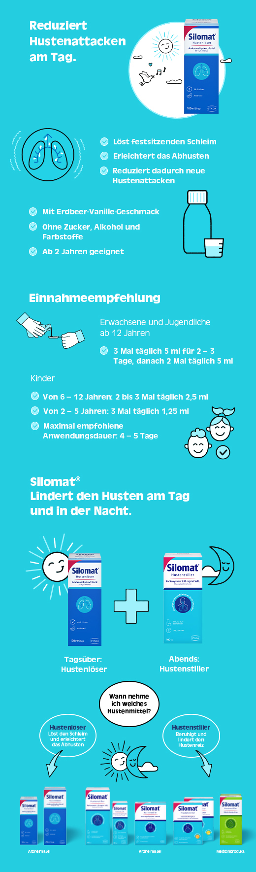 Mit den Silomat® Hustenstillern haben Sie bereits bewährte Helfer bei Reizhusten. Vor allem für den Abend und eine ruhigere Nacht. Mit dem Silomat® Hustenlöser erscheint nun die ideale Ergänzung für den Tag.