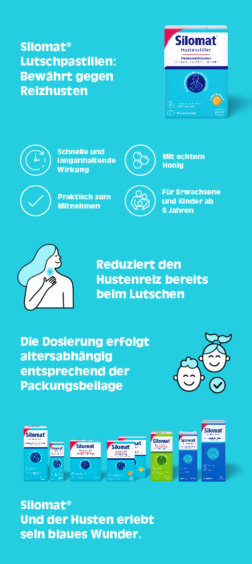 Dextromethorphan, der am besten untersuchte hustenstillende Wirkstoff der Welt in den Silomat® Lutschpastillen mit echtem Honig, dämpft die Wahrnehmung des Hustenreizes. So können sich die Schleimhäute in den Bronchien erholen und auch Sie können wieder zur Ruhe kommen. Das Lutschen schafft bereits erste Linderung während sich die Wirkung sukzessive aufbaut.